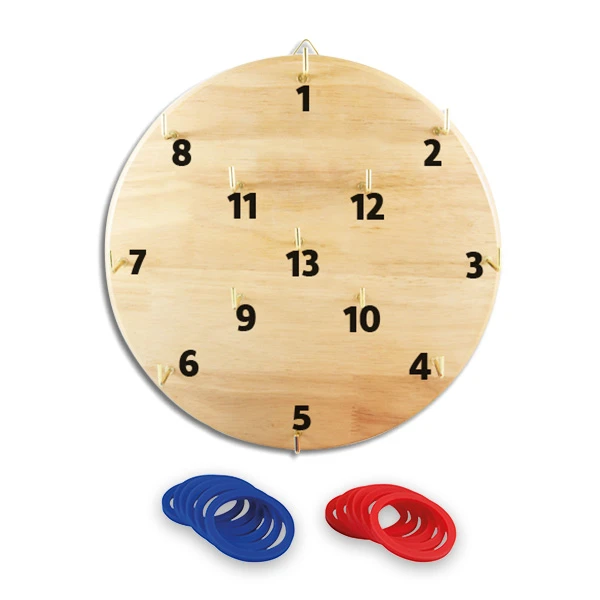 | چیدمان بازی | اول میلهها رو به صفحهی چوبی وصل کنید. میلهها مثل پیچ میمونند. با چند بار چرخوندن تو جاشون محکم میشن. صفحه رو روی یه دیوار یا هر جایی که دوست داید، نصب کنید. هر بازیکن یه رنگ رو انتخاب می کنه و شش تا حلقهش رو برمیداره |