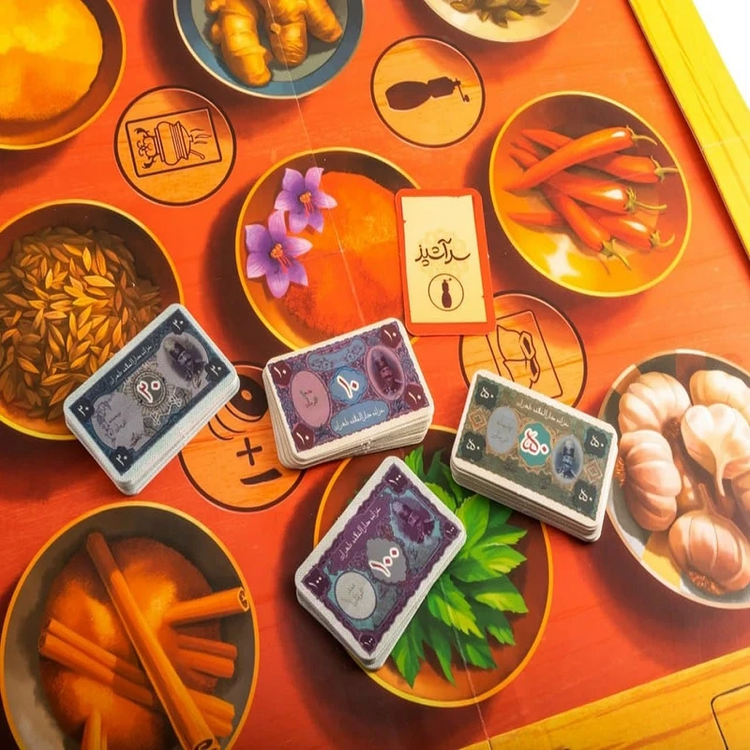 برای آماده کردن بازی قبل از همه چیز زمینه رو باز کنین و قطعات حاشیه رو با استفاده از پین به صفحه وصل کنین. روی سکهها برچسب عدد دار و پشتشون طرح بدون عدد همون رنگ رو بچسبونین و سکهها رو بین بازیکنها تقسیم کنین. هر بازیکن ۶ سکهی یه رنگ میگیره. حالا به هر بازیکن یه اسکناس ۱۰۰ تومنی، ۵۰ تومنی و ۲۰ تومنی و سه تا اسکناس ۱۰ تومنی بدین. بقیهی پولها رو هم بذارین توی «بانک». کارتهای ادویه رو بر بزنین و دو دسته کنین و به پشت بذارین کنار زمینه. قطعات حاشیه رو یادتونه؟ روی قسمتهای مختلفش جای هر ادویه مشخص شده. هر کارت ادویهای که رو بشه باید سر جای خودش قرار بگیره. با توجه به این جدول میتونین کارتهای ادویه رو، رو کنین و توی جایگاه مشخص شده قرار بدین. این کارتهای رو شده، کارتهایی هستن که این دور برای فروش توی دکان آمیرزا موجودن و به قول معروف روی «پیشخوان» مغازهان. کارتهای ادویهی ترکیبی رو هم با توجه به جدول جدا کنین و دم دست بذارین. چجوری اولین نفر رو انتخاب کنیم؟ هرکس آشپزیش بهتره میشه بازیکن اول!